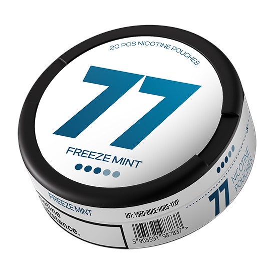 77 Freeze Mint Strong tillverkas av LUNA Corporate och är ett vitt snus i slim-format. Smak av kylig mint med mindre sötma för en mer balanserad upplevelse. Produkten innehåller 20 prillor per dosa, där varje prilla väger 0,65 g. Nikotinhalten ligger på 10,4 mg per portion, vilket motsvarar 1,6 %, och placerar produkten i styrkeklassen 3 Stark.