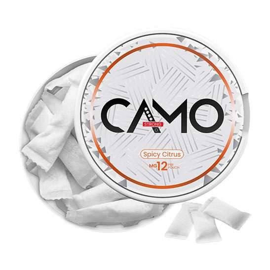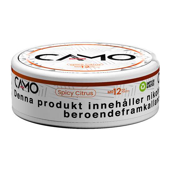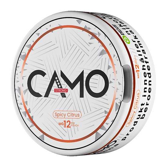 CAMO Spicy Citrus Extra Strong är en tobaksfri nikotinprodukt från tillverkaren UAB Global Snus och säljs under varumärket CAMO. Den tillhör produktkategorin vitt snus och har en smaksättning som kombinerar citrus med kryddiga inslag. Prillorna har ett slim-format och innehåller 12 mg nikotin per prilla. Produkten är tobaksfri och tillverkad för en jämn och kontrollerad nikotinleverans. En dosa innehåller 20 prillor.
