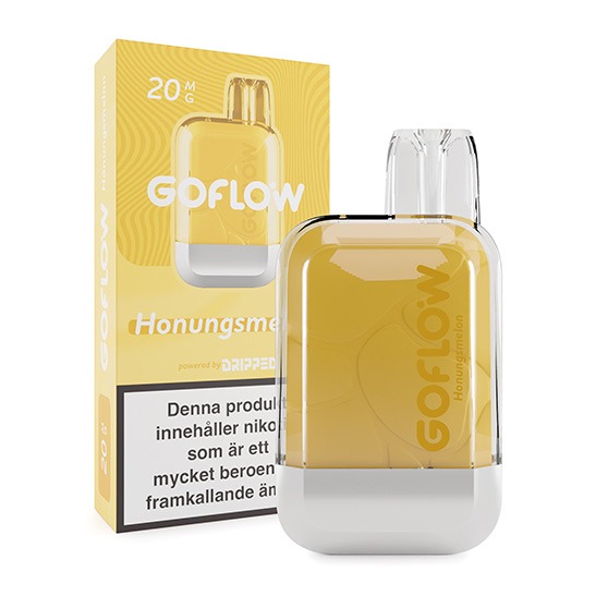 Dripped GoFlow Honungsmelon 20mg är en engångsvape med 20 mg/ml nikotinsalt och upp till 800 puffar. Mild och lätt söt smakprofil med tydlig honungsmelonkaraktär. Ger en mjuk och jämn fruktton utan kylande inslag. Vänta upp till 90 sekunder efter att silikonstiftet tagits bort så att vätskan hinner fördelas korrekt i coilen.