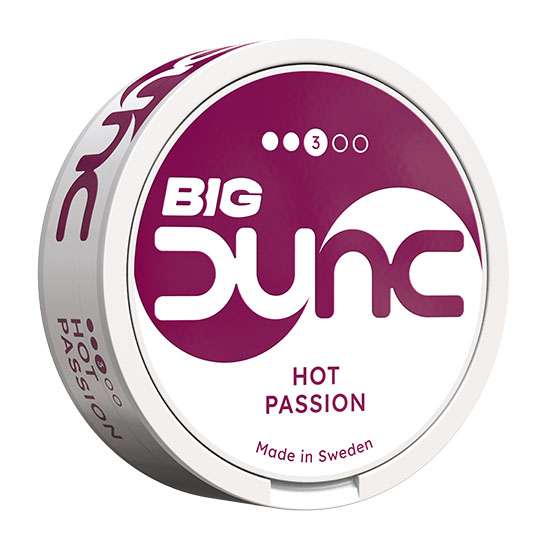 DUNC Big Hot Passion Strong är ett tobaksfritt vitt snus från Snus Brothers Brands AB, framtaget för snusare som vill ha en stark smak kombinerad med högre nikotinhalt. Smaken förenar mild hetta från pimiento med den tropiska syrligheten och sötman från passionsfrukt, vilket ger en karaktär som skiljer sig från mer traditionella smaker. Prillorna är i large format och ger en fylligare känsla under läppen samtidigt som de levererar snabb frisättning av både nikotin och smak. Varje dosa innehåller 15 prillor i ett mjukt vitt nonwoven-material som är behagligt mot tandköttet och minskar rinnighet.
