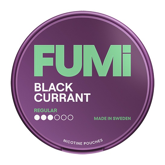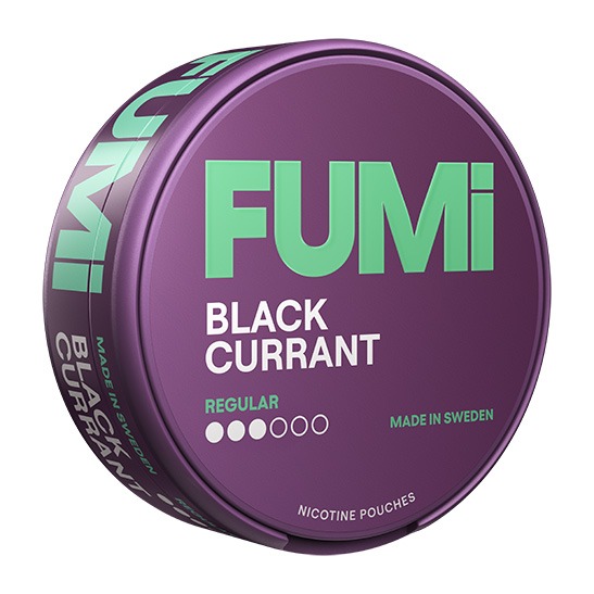 FUMi Blackcurrant Regular har smaken svarta vinbär i formatet slim med en nikotinstyrka på 0,6 % (ca 4 mg/prilla) och styrkan 2 Normal. Snuset tillverkas av Helix Sweden AB under varumärket FUMI, som arbetar med tobaksfria nikotinpåsar i flera smakprofiler. En dosa innehåller 20 prillor och totalvikten är 14 gram. Slim-formatet kännetecknas av en smal prilla på 0,7 gram med en yta som gör att smak och nikotin frigörs gradvis. Snuset tillhör kategorin Vitt Snus.