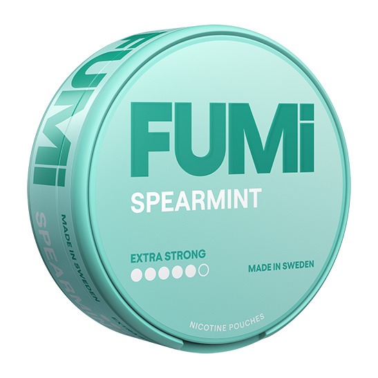 FUMi Spearmint Extra Strong har smaken spearmint i formatet slim med en nikotinstyrka på 1,6 % (ca 11 mg/prilla) och styrkan 4 Extra Stark. Snuset tillverkas av Helix Sweden AB under varumärket FUMi, som utvecklar tobaksfria nikotinpåsar i olika styrkor och smakprofiler. En dosa innehåller 20 prillor och totalvikten är 14 gram. Slim-formatet innebär en prilla som väger 0,7 gram och frigör smak och nikotin gradvis. Snuset tillhör kategorin Vitt Snus.