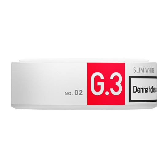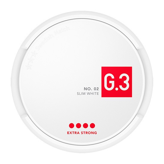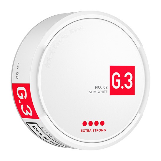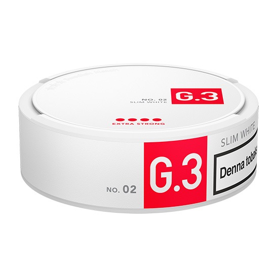 G.3 Slim White Extra Strong är ett extra starkt snus från tillverkaren Swedish Match och tillhör produktgruppen White Portionssnus. Prillorna har en kraftig och kryddig tobakskaraktär med inslag av bergamott och gröna örter, samt aningen te och hö. Formatet på prillorna är Slim vilket ger dig en långsmal prilla som är torr på ytan med fuktigt innehåll för låg rinnighet och en lång smakrelease. Fukthalten på snuset är 47% och dess hållbarhet är ca 4 månader.