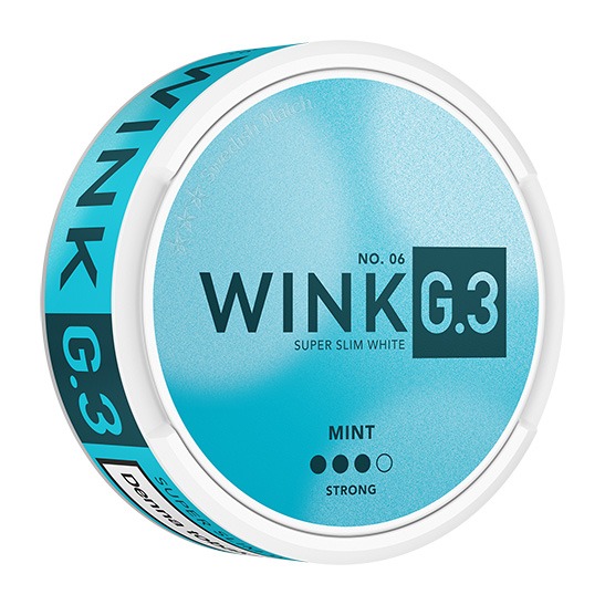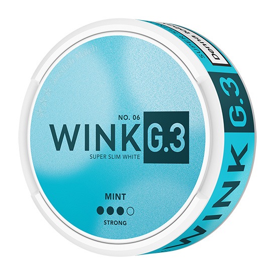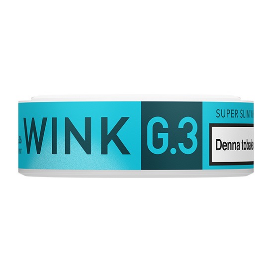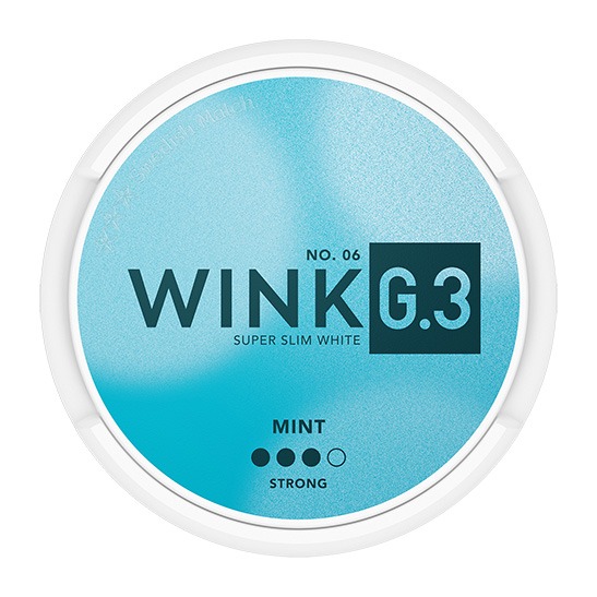 G.3 Wink Super Slim White Strong, tidigare G.3 Blue Mint Super Slim White Strong, kommer från tillverkaren Swedish Match. Snuset är av typen White Portion. Prillan har en ljus och kryddig tobakskaraktär med tydliga smakinslag av pepparmint, samt aningen örter och vanilj. Formatet Super Slim ger dig en diskret och långsmal prilla med optimerad passform som är torr på ytan med fuktigt innehåll för låg rinnighet och en lång smakrelease. Snusets fukthalt är 46%. Hållbarheten på snuset är ca 4 månader.