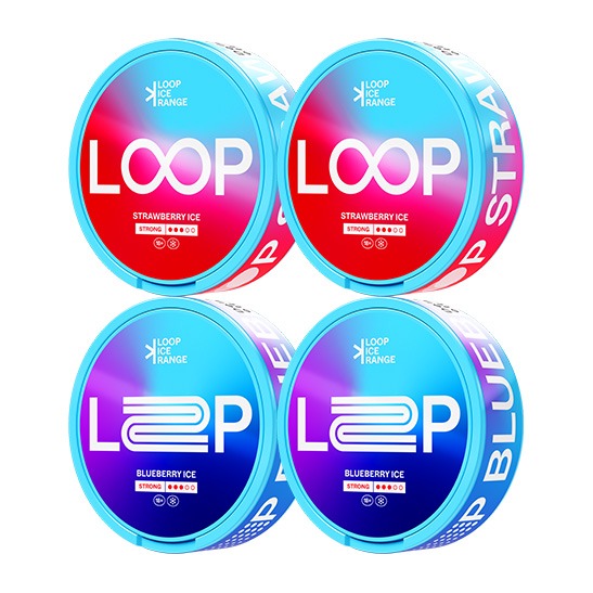 LOOP Mix 4 pack Strawberry och Blueberry Ice Strong är ett mix-pack med Vitt Snus i slim-format.