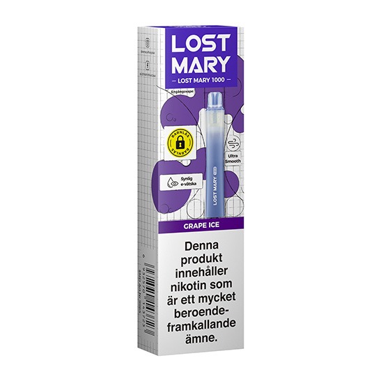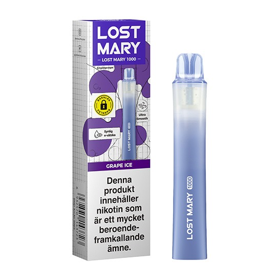 Lost Mary 1000 Grape Ice 20mg är en engångsvape från Lost Mary med fokus på en tydlig och fruktig druvsmak. Den söta druvkaraktären kompletteras av en mild ice-effekt som ger en sval avslutning utan att ta över smaken. Enheten är färdig att användas direkt ur förpackningen, kräver varken laddning eller påfyllning och ger upp till cirka 1000 bloss. Den aktiveras genom tre snabba puffar och tillhör kategorin engångsvape.