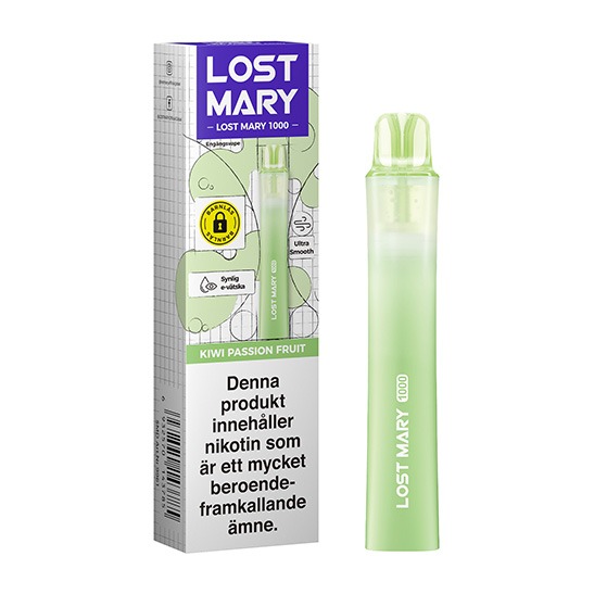 Lost Mary 1000 Kiwi Passion Fruit 20mg är en engångsvape från Lost Mary med en tydligt tropisk smakprofil. Kombinationen av kiwi och söt passionsfrukt ger en balanserad fruktblandning med både syra och rund sötma. Enheten är färdig att användas direkt ur förpackningen, kräver varken laddning eller påfyllning och ger upp till cirka 1000 bloss. Den aktiveras genom tre snabba puffar och tillhör kategorin engångsvape.