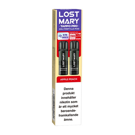 Lost Mary TAPPO PRO Pod x2 Apple Peach 20mg är en pod till Lost Mary TAPPO-devicen. Förpackningen innehåller två förfyllda pods med e-vätska som innehåller 20 mg nikotin per milliliter i form av nikotinbensoat. Pods fästs direkt på devicen utan behov av påfyllning eller underhåll.