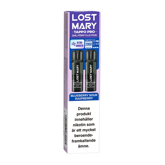 Lost Mary TAPPO PRO Pod x2 Blueberry Sour Raspberry 20mg är en pod till Lost Mary TAPPO-device. Varje förpackning innehåller två förfyllda pods med e-vätska innehållande 20 mg nikotin per milliliter i form av nikotinbensoat. Pods fästs direkt i devicen utan behov av påfyllning eller underhåll.