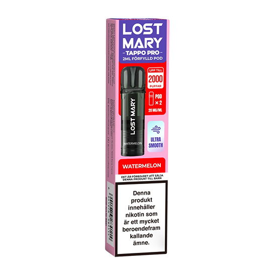 Lost Mary TAPPO PRO Pod x2 Watermelon 20mg är en engångspod för Lost Mary TAPPO-enhet. Varje förpackning innehåller två förfyllda pods, designade för enkel anslutning till enheten utan påfyllning eller underhåll. Pods är försedda med e-vätska innehållande 20 mg nikotin per milliliter i form av nikotinsalt. Produkten tillverkas av Lost Mary, ett varumärke känt för sina vape-produkter.