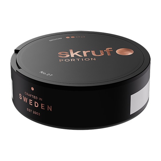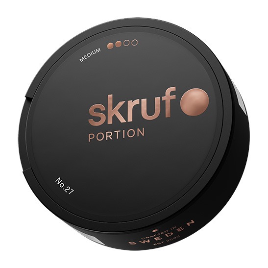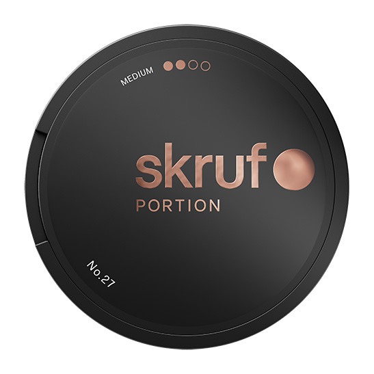 Snuset Skruf no 27 Original Portion har styrkan 2 Normal. Prillorna innehåller 12 mg nikotin per påse, eller omräknat till procent blir det 1,3% nikotinhalt. Varje snusdosa innehåller 24 stycken prillor och varje prilla väger 0,9 gram vilket ger en total snusvikt i en dosa på 21,6 gram snus.