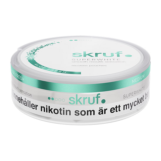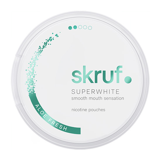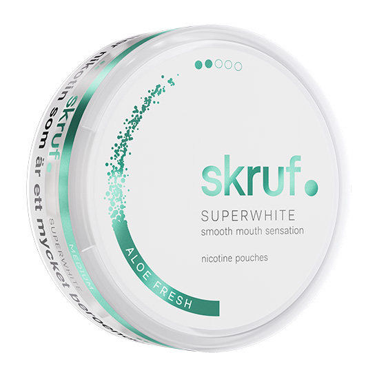 Skruf SUPERWHITE Aloe Fresh är en produkt från Skruf Snus AB och tillhör kategorin Vitt Snus, även kallat nikotinpåsar eller All White. Prillan är tobaksfri men innehåller nikotin. Smaksättningen är en kombination av söt aloe vera och grönmynta. Formatet är Slim, vilket innebär att prillan är något mindre och anpassad för en bekväm passform under läppen. Varje dosa innehåller 22 prillor med en totalvikt på 15,8 gram.