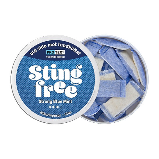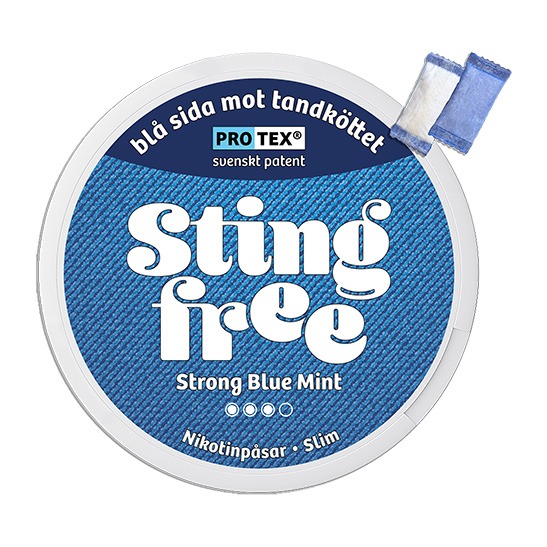 Stingfree Strong Blue Mint är ett tobaksfritt vitt snus från Stingfree AB, tillverkat i Slim-format och utvecklat med den patenterade Protex®-tekniken. Nikotinstyrkan uppgår till 12 mg/g, motsvarande cirka 6,6 mg per prilla, och styrkan är klassificerad som 2 Normal. Snuset innehåller totalt 20 prillor per dosa. Varje prilla väger 0,55 gram och är uppbyggd med två funktionella sidor, där den blå sidan med Protex®-barriär är avsedd att placeras mot tandköttet, medan den vita perforerade sidan möjliggör frisättning av smak och nikotin. Snuset tillhör kategorin Vitt Snus.