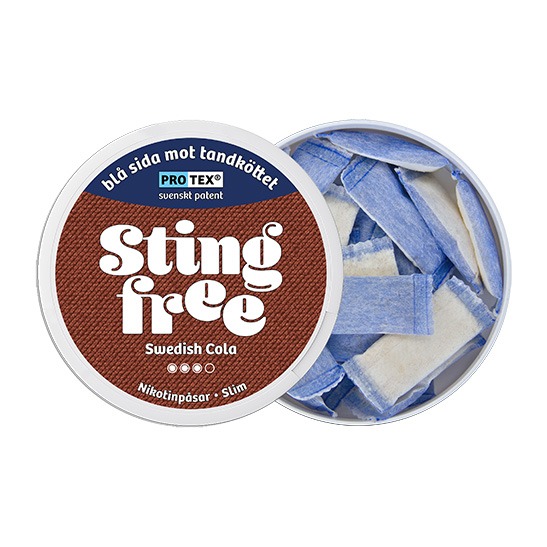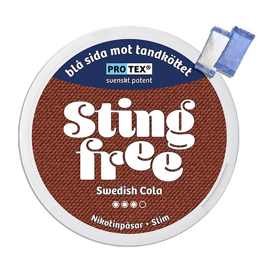 Stingfree Swedish Cola är ett tobaksfritt vitt snus från Stingfree AB, tillverkat i Slim-format och utvecklat med den patenterade Protex®-tekniken. Nikotinstyrkan uppgår till 12 mg/g, motsvarande cirka 6,6 mg per prilla, och styrkan är klassificerad som 2 Normal. Snuset innehåller totalt 20 prillor per dosa. Varje prilla väger 0,55 gram och är uppbyggd med två funktionella sidor, där den blå sidan med Protex®-barriär är avsedd att placeras mot tandköttet, medan den vita perforerade sidan möjliggör frisättning av smak och nikotin. Snuset tillhör kategorin Vitt Snus.