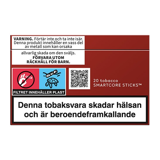 Använd inte andra generationens IQOS, IQOS Ilumas SMARTCORE-stickorna TEREA med tidigare generationer av IQOS, eftersom det kan skada din enhet. Ta inte isär eller svälj SMARTCORE-tobaksstickor eftersom produkten innehåller en vass metalldel som kan orsaka skada om den sväljs. Förvara utom räckhåll för barn.