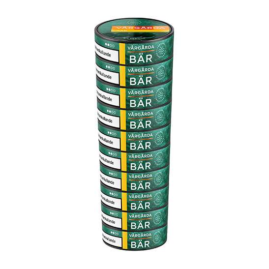 Snuset Vårgårda Bär har styrkan 2 Normal. Varje prilla innehåller 10 mg nikotin eller omräknat i nikotinhalt så blir det 1% nikotin. En prilla väger 0,9 gram och en dosa innehåller 22 stycken prillor, vilket ger en total snusvikt per dosa på 19,8 gram snus.