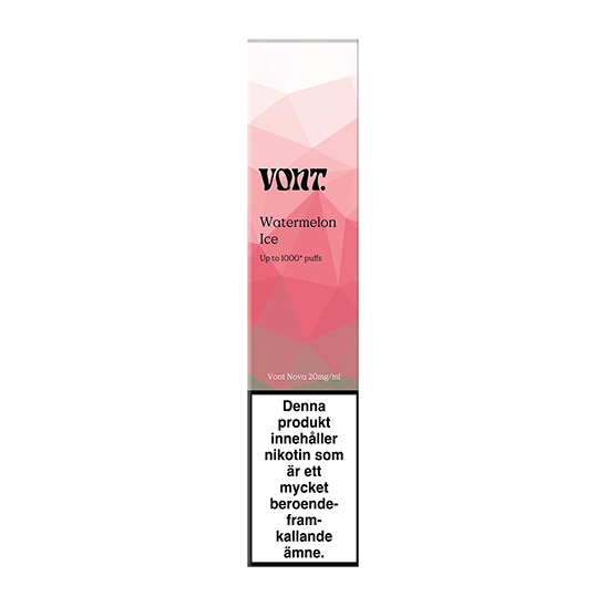 Vont Nova Watermelon Ice 20mg är en engångsvape från Vont. Produkten är förfylld och färdig att använda direkt ur förpackningen, utan behov av laddning eller påfyllning. Den aktiveras genom inhalering och är utrustad med en mesh coil på 1,95 ohm, vilket bidrar till jämn och stabil ångproduktion. Varje enhet innehåller 2 ml e-vätska med nikotinhalt 20 mg/ml och ger upp till cirka 1000 puffar, beroende på inhalationsmönster.