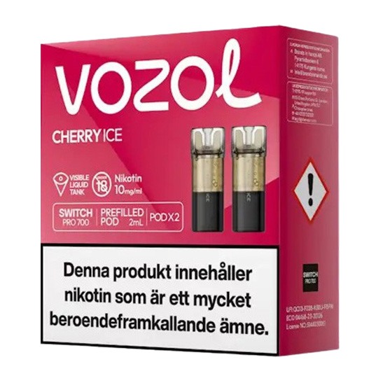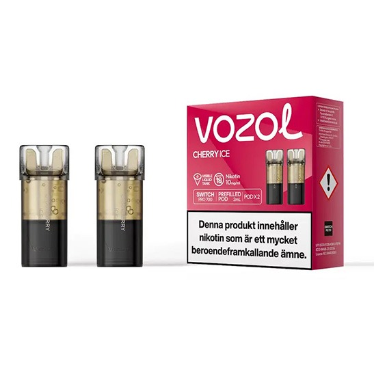 Vozol Switch Pro Pod x2 Cherry Ice 10mg är ett 2-pack förfyllda pods till Vozol Switch Pro podsystem. Smaken består av körsbär med kylande effekt. Varje pod innehåller 2 ml e-vätska med 10 mg/ml nikotinsalt och ger upp till cirka 700 bloss.