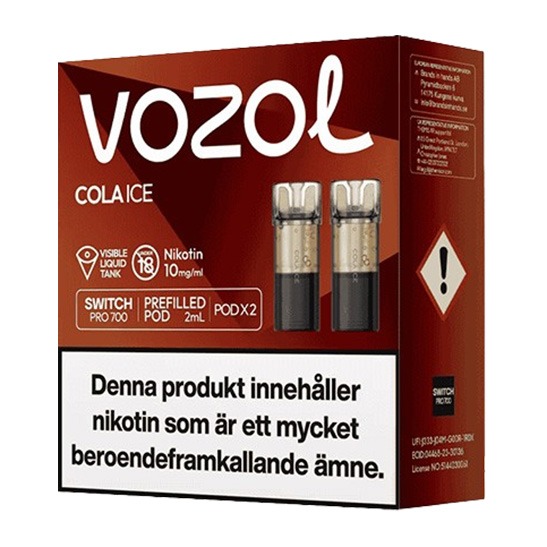 Vozol Switch Pro Pod x2 Cola Ice 10mg är pods avsedda för användning med Vozol Switch Pro podsystem. Förpackningen innehåller två förfyllda pods, färdiga att använda direkt utan påfyllning eller justering. När en pod är förbrukad byts den enkelt ut mot en ny.