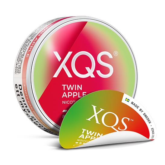 XQS Twin Apple Strong har en syrlig och söt kombination av röda och gröna äpplen. Snuset är av typen All White, eller nikotinpåsar och vitt snus som typen även kallas, en prilla helt utan tobak fast med nikotin. Prillan har formatet Slim som är en diskret mindre prilla vilken har en bra passform under läppen.