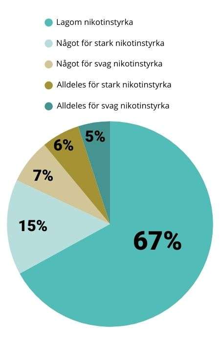 Bara en mindre andel tycker att styrkan kunde justeras åt något håll. Det är inte förvånande, eftersom nikotinupplevelsen är väldigt individuell. Faktorer som ens egen vana, känslighet och hur ofta man använder snus spelar stor roll för hur styrkan upplevs.